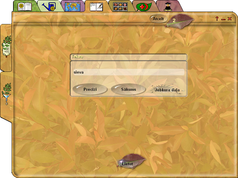 Gūsiet jaunas zināšanas aizraujošā spēlē. Tiek piedāvāti divi spēles varianti - auga nosaukuma noteikšana pēc attēla un auga attēla noteikšana pēc nosaukuma. Izmantojot augu atlasi, var samazināt spēlē izmantoto augu skaitu.