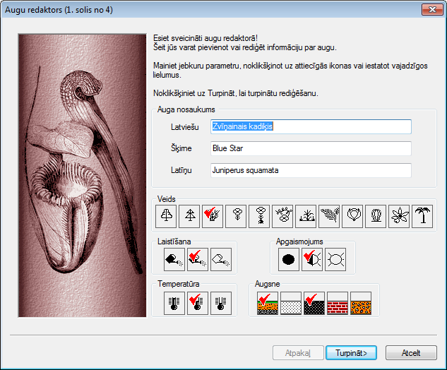 Šajā redaktorā iespējams pievienot jaunus augus, dzēst vai mainīt parametrus (nosaukumu, klasifikāciju, veidu, attēlu, lapu, ziedu, augļu krāsu vasarā un rudenī, ziedēšanas laiku, izmērus u.c.) esošajiem augiem.